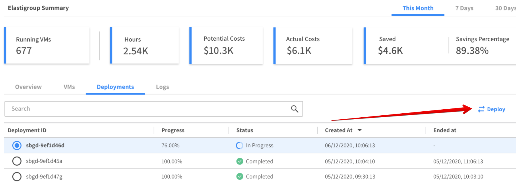 To view information about a deployment in progress or past deployments, go to the Deployments tab in your Elastigroup.