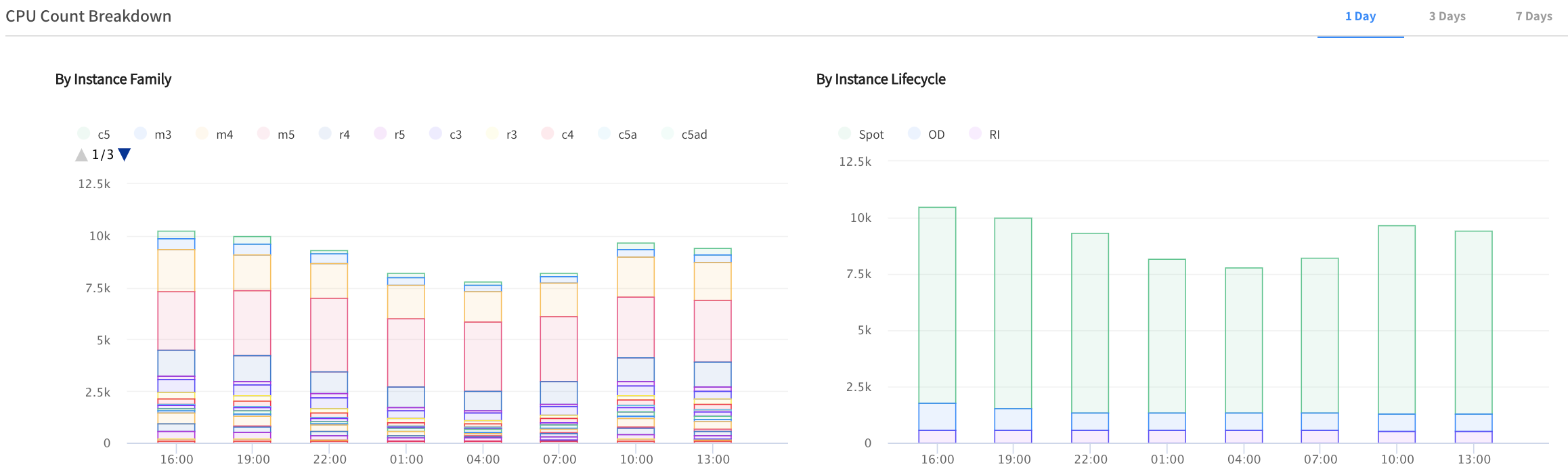 • Running Hours Breakdown: This graph gives a breakdown by lifecycle of the hours your instances are running. Trends plotted include Spot Hours, OD Hours, and Average Instance Count.